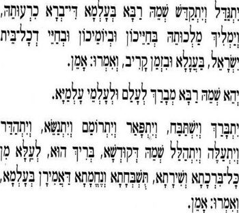 The Kaddish is composed mostly in Aramaic, the language commonly spoken by Jews in Israel from about the fifth century B.C.E. until the fifth century C.E. The prayer incorporates praises of the Almighty modeled after verses in the Hebrew Bible such as Ezekiel 38:23 and Daniel 2:20. The central theme of the Kaddish prayer is reflected in the congregational response: “Yehei shmei raba mevorakh l’olam ulalmei almaya, May God’s great name be blessed forever and to all eternity.” This is an apparent Aramaic translation of the Hebrew “Baruch shem kavod malchuto l’olam va’ed, Blessed be God’s name, whose glorious kingdom is forever,” a line familiar to every Jew since it is coupled so closely with the Shema. Such a translation would, again, connect to the Kaddish very closely with the words of the Lord’s Prayer, “For thine is the kingdom, and the power, and the glory, forever.”
